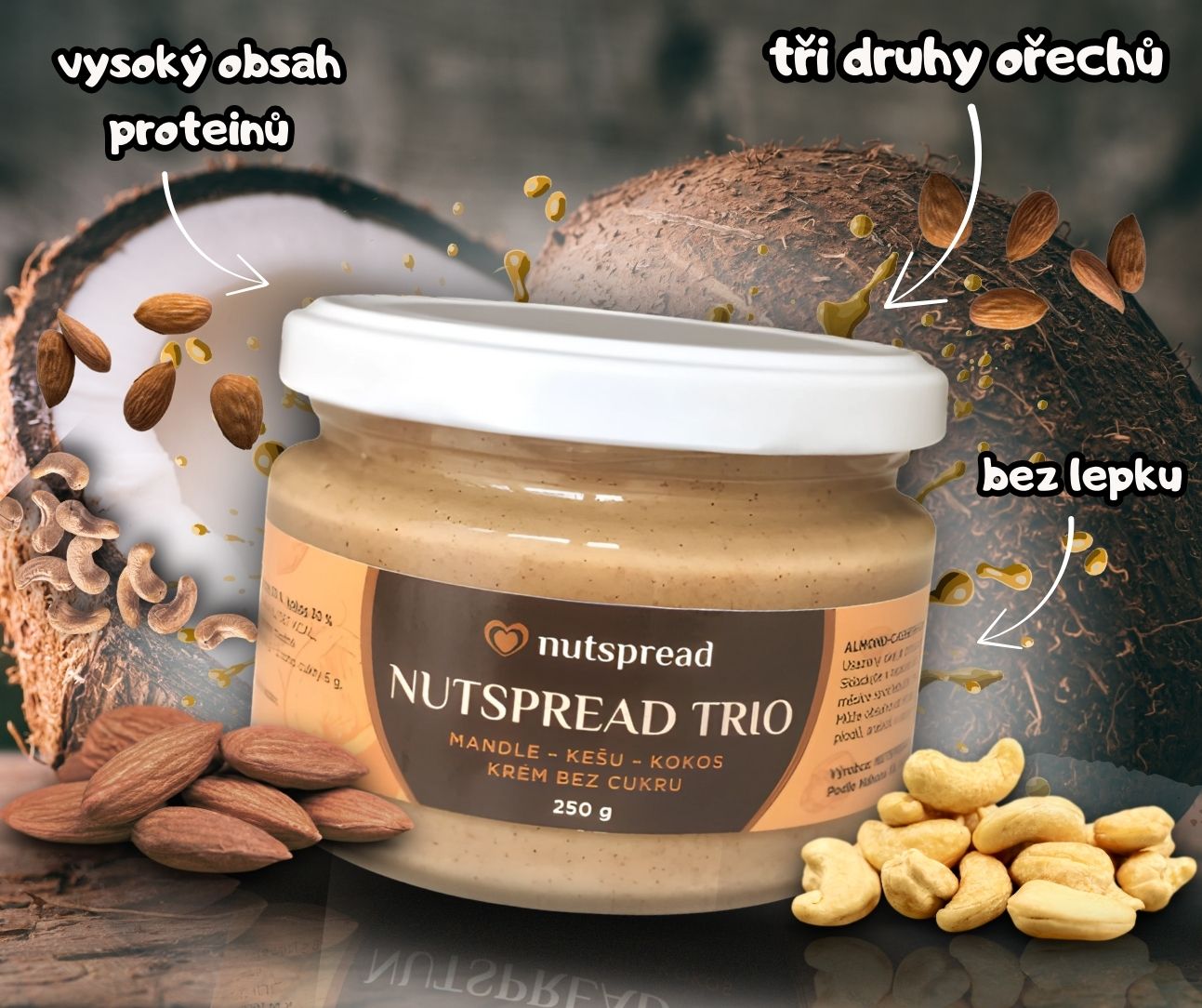 A pokud jde o nutriční hodnoty, Nutspread Trio kombinuje to nejlepší z nejlepšího - mandle plné hořčíku pro krásné vlasy, kešu oříšky Nutspread pro tvorbu tryptofanu i přirozeně slaďoučký kokos - podporavVaší štítné žlázy, dobrého trávení i zdravé pleti.