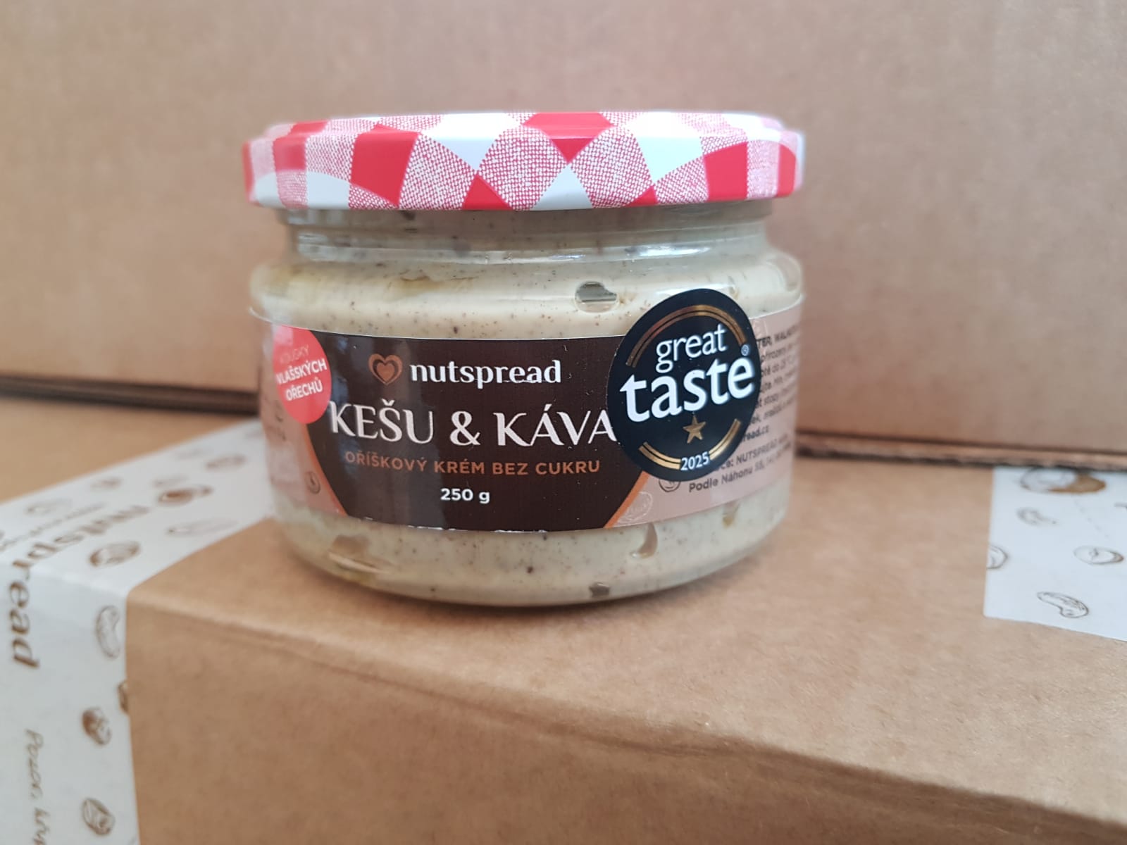 Kešu máslo s kávou a vlašskými ořechy?! Pro mnoho z Vás je to vůbec to nejlepší ořechové máslo, které kdy ochutnali. Tento luxusní oříškový krém vznikl jako dárek Nutspread ke Dni Dětí 2015 a podle všeho se opravdu vydařil - ojedinělá a nápaditá chuťová kombinace vytváří oříškovou pomazánku tak dobrou, že je škoda ji vůbec na něco namazat :-) Po neskutečných deseti letech v našem sortimentu se tomuhle máslu dostalo ocenění nejvyššího - získalo na prestižní gastronomické soutěži v Londýně cenu Great Taste Awards! Gratulujeme :)