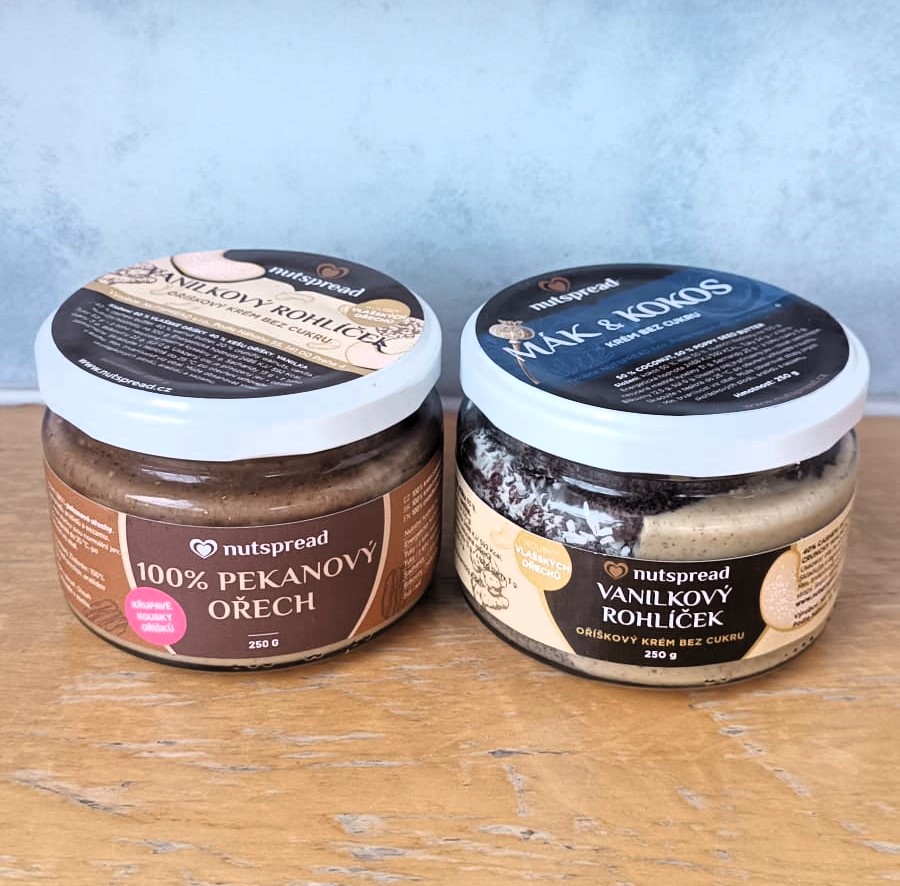 Křupavý ořechový krém z vlašských ořechů, kešu ořechů a vanilky a 100% pekanový krém. Bez cukru, lepku a přídatných látek. Vysoký obsah proteinů, vhodné pro sportovce a vegany.